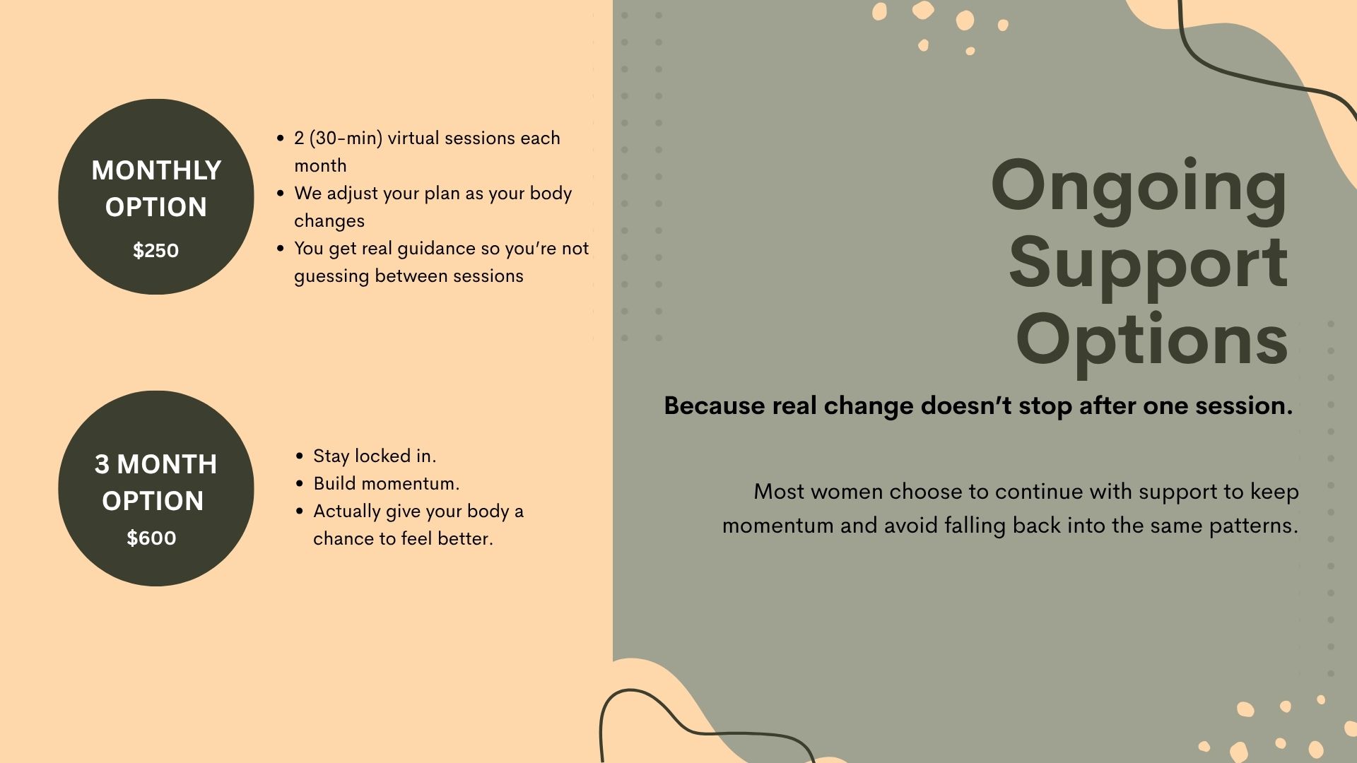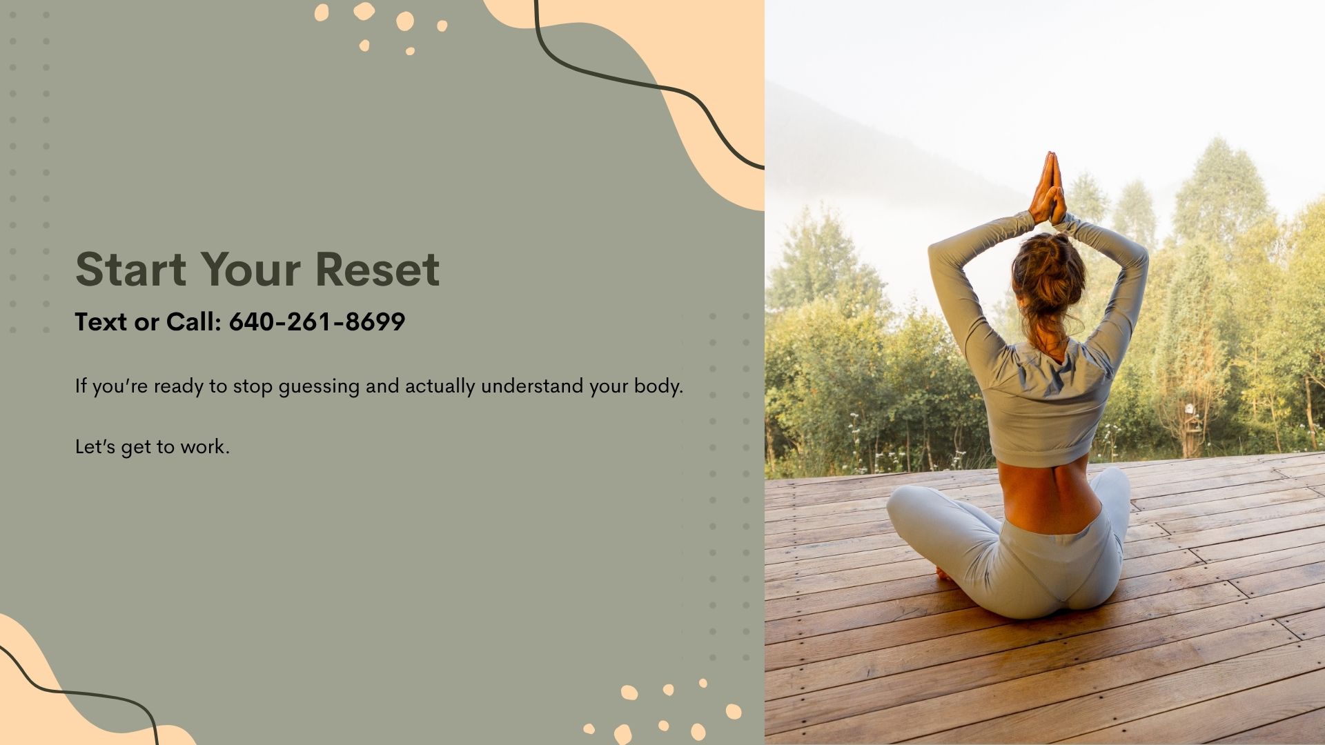 My goal is simple: give you clarity, confidence, and a plan so you can feel better in your body and know exactly what to do moving forward.