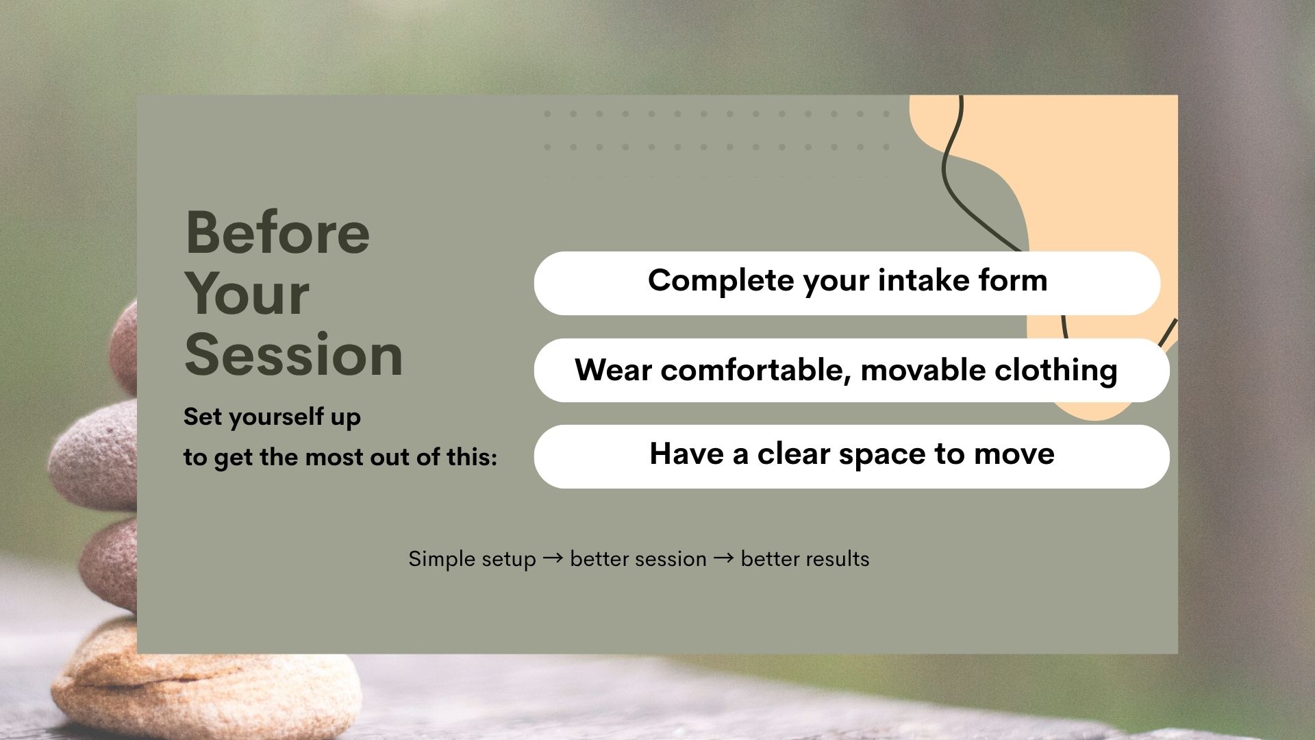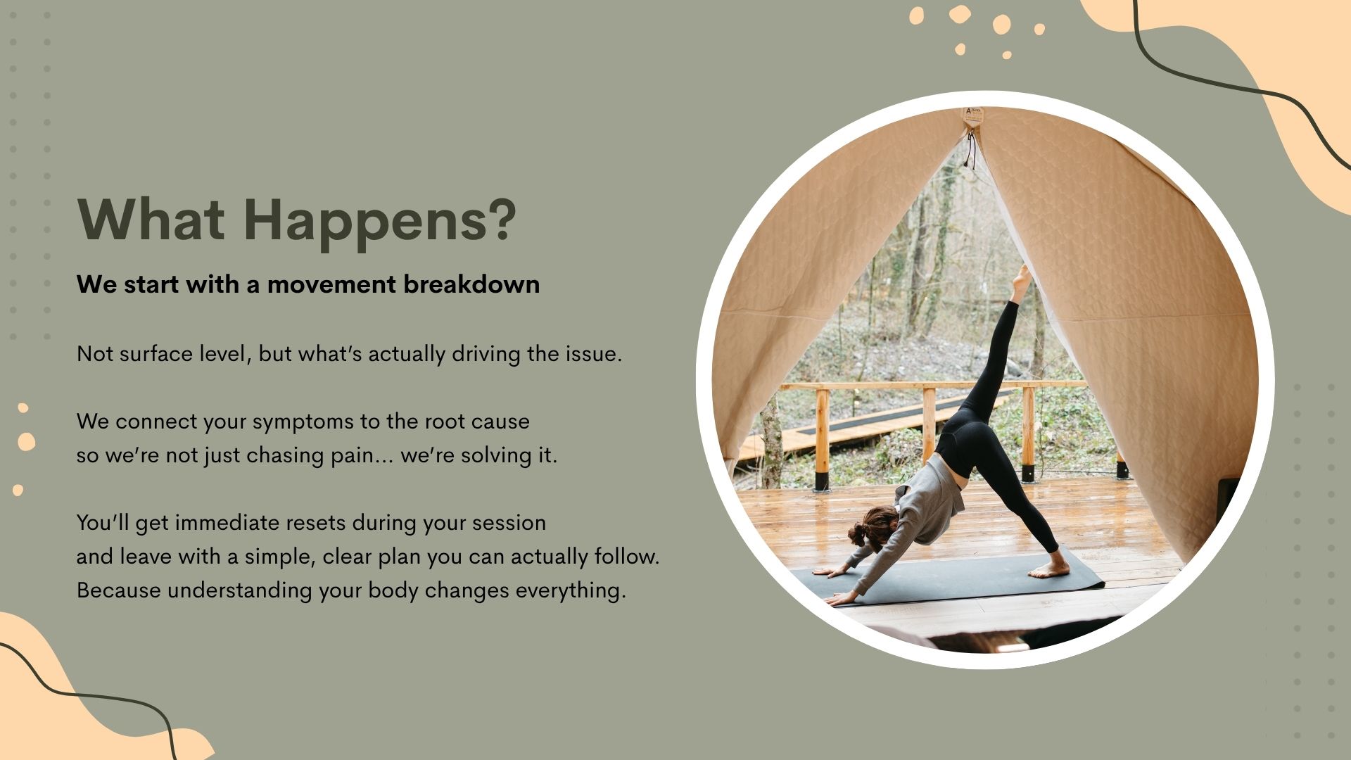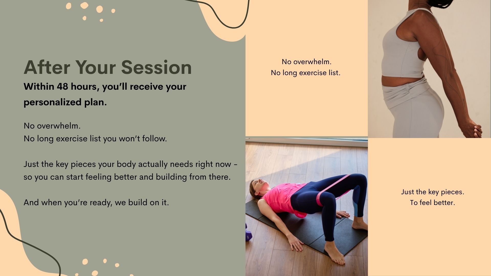 My goal is to help women feel supported, not overwhelmed. You deserve to understand why your body feels the way it does, not be told “it’s normal,” to stretch more, or to just push through it. I focus on education, movement quality, and clear, practical next steps you can actually use in your day-to-day life.